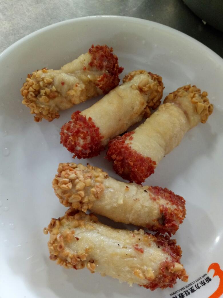 一端分別裹上蛋液,火腿沫,另一端分別裹上蛋液,松子沫