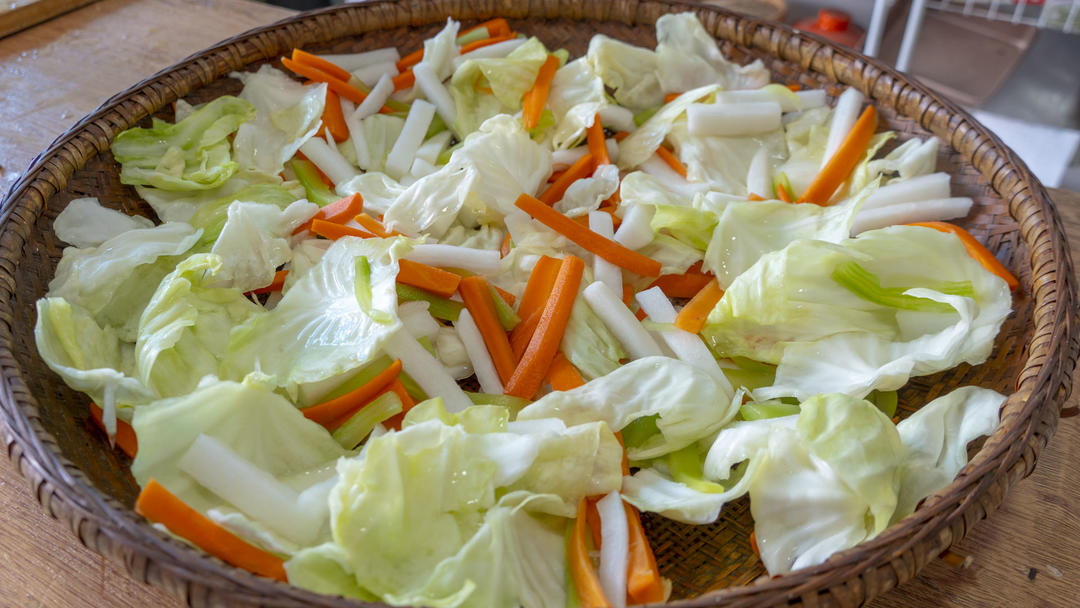 我們再來看一下醃制的蔬菜,已經出了許多水,撈出來加清水再沖洗一遍,然後也放到簸箕上晾幹水分,晾幹後更脆也更容易保存。